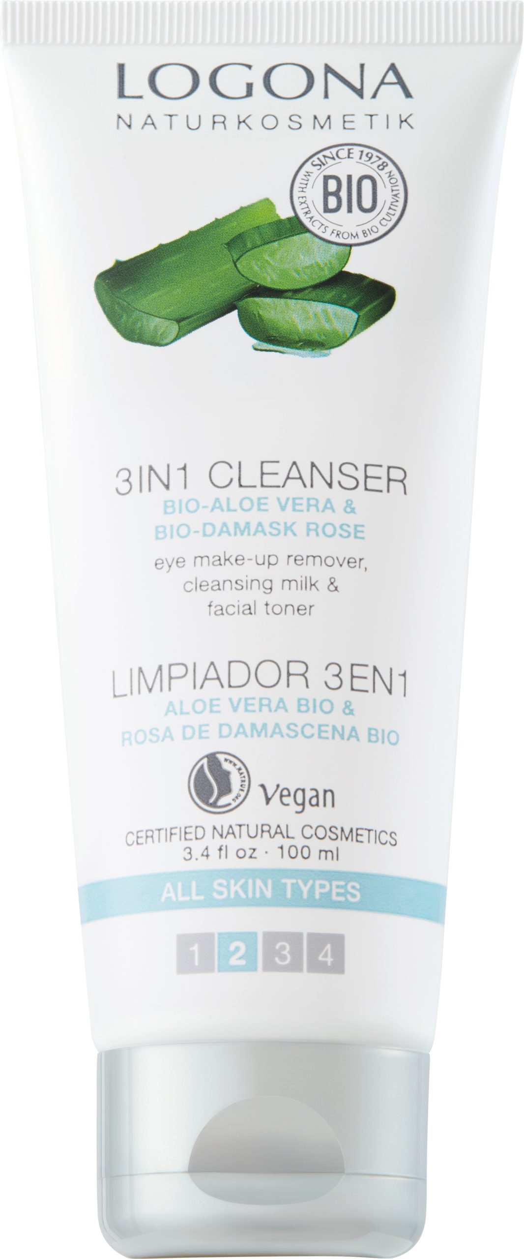 Logona 3-i-1 Ansiktsrens er øyemakeupfjerner, rensemelk & ansiktstoner i ett og samme produkt. Passer for alle hudtyper.