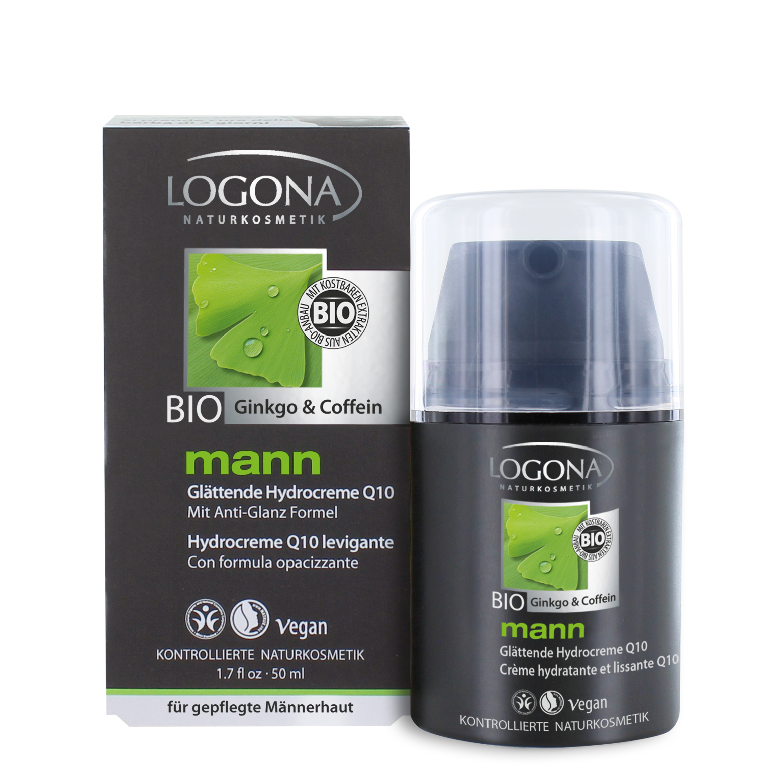 Logonas utjevnende, oppstrammende og fuktighetsgivende ansiktskrem for menn med Q10 inneholder en effektiv kombinasjon av spesielt utvalgte ingredienser tilpasset mannens hud. De aktive ingrediensene som oppfriskende kaffein og ginko-ekstrakt kombinert med utgjevnende Q10, Hyaluronsyre og ekstrakt av sjøgress pleier huden, gir intensivt fuktighet og reduserer rynker – uten å virke fetetnde. Denne lette kremen pleier også ditt 3-dagersskjegg, lindrer irritert hud og absorberes raskt. For en oppkvikkende start på dagen!Denne utjevnende, oppstrammende og fuktighetsgivende kremen med Q10 inneholder en effektiv kombinasjon av spesielt utvalgte veganske ingredienser tilpasset mannens hud. De aktive ingrediensene som oppfriskende organisk kaffein og ginko-ekstrakt kombinert med utgjevnende Q10, Hyaluronsyre og ekstrakt av sjøgress pleier huden, gir intensivt fuktighet og reduserer rynker – uten å virke fettete!